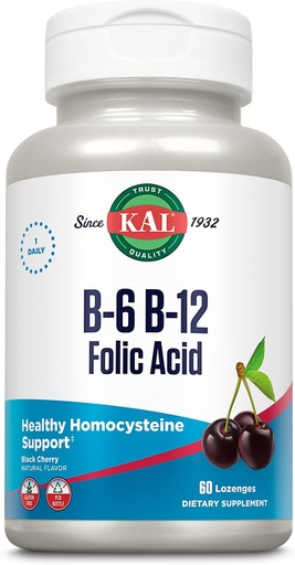KAL Vitamin B-6 B-12 Folic Acid Supplement, B Vitamins for Healthy Energy, Heart & Red Blood Cell Support, w/Vitamin B12 Methylcobalamin and Folate, Natural Cherry, Gluten Free, 60 Serv, 60 Lozenges