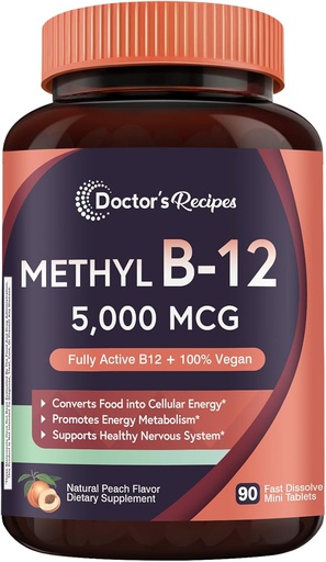 Doctor's Recipes Vitamin B12, Methylcobalamin 5000 mcg 90 Fast Dissolve Tablets, Natural Peach Flavor, Vegan Methyl, Energy Metabolism & Nervous System