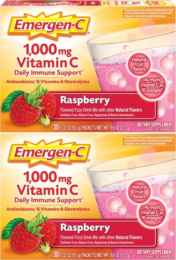 Emergen-C 1000mg Vitamin C Powder, with Antioxidants, B Vitamins and Electrolytes, Vitamin C Supplements for Immune Support, Caffeine Free Drink Mix, Raspberry Flavor - 60 Count/2 Month Supply