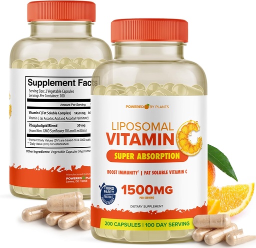 Liposomal Vitamin C Capsules - 1500mg Buffered High Absorption Vitamin C Supplement & Collagen Booster - Fat Soluble Immunity Support Ascorbic Acid Supplement 200 Vegan Capsules