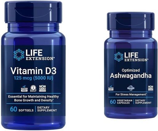 Life Extension Vitamin D3 5000 IU, Ashwagandha - Stress Relief, Focus, Memory, Mood Support - Non-GMO Supplement Bundle