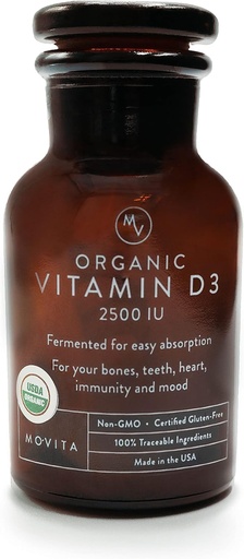Movita Certified Organic Vitamin D3 2500IU – Supports Energy, Immune Health & Bone Strength – Fermented Whole Foods, Organic, Vegan, Gluten-Free, Non-GMO – 30-Day Supply (Glass Bottle)