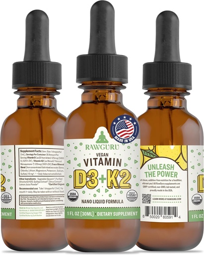 RawGuru Vitamin D3 and K2 - Organic Vegan Vitamin D3 with K2 & Trace Minerals - Nano-Processed Antioxidant & Immune Support Supplement Tincture - 30 Servings of Vegan Drops per 30 ml, Pack of 1